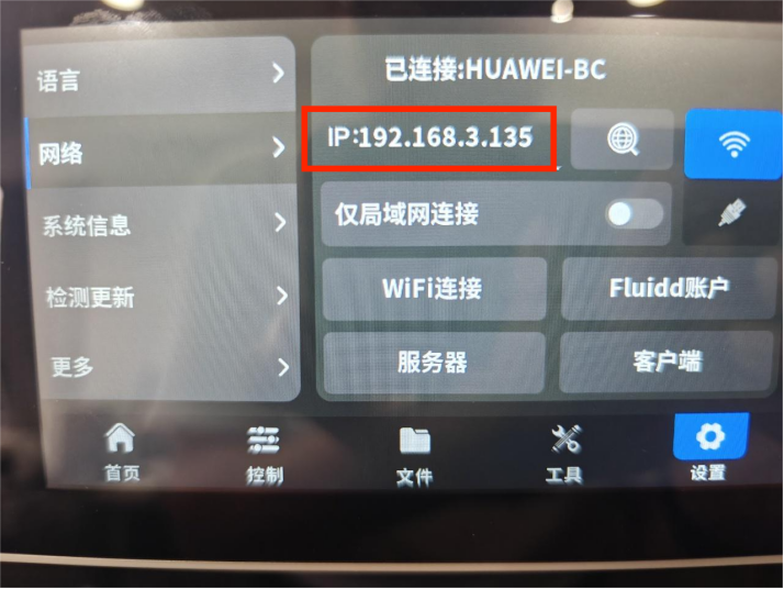为了获得更精准的打印温度,强烈建议进行温度控制PID校准,点击屏幕WiFi图标,获取打印机IP地址。