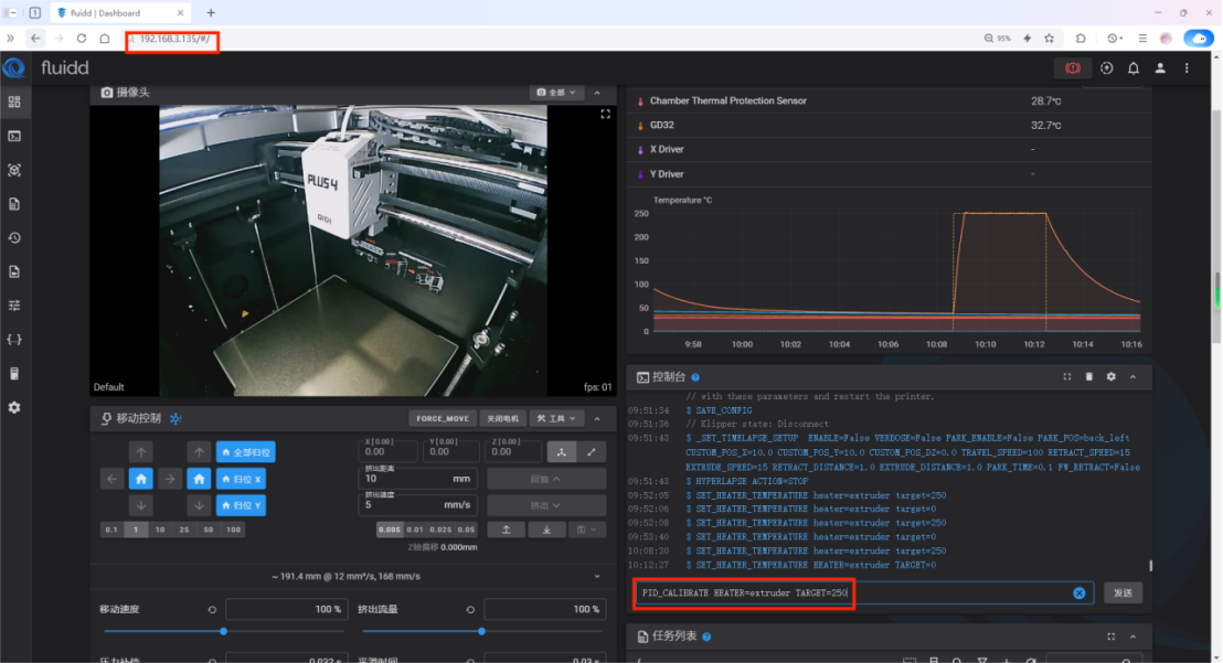 将IP地址输入浏览器(电脑/手机与打印机需要连接同一个WiFi),打开打印机后台,在控制台位置输入: PID_CALIBRATE HEATER=extruder TARGET=250