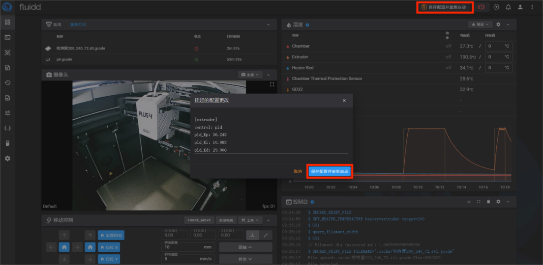 此刻机器将自动进行温度PID校准,在自动校准完成后,右上角将出现保存配置并重新启动选项,请点击同意保存配置并重新启动。